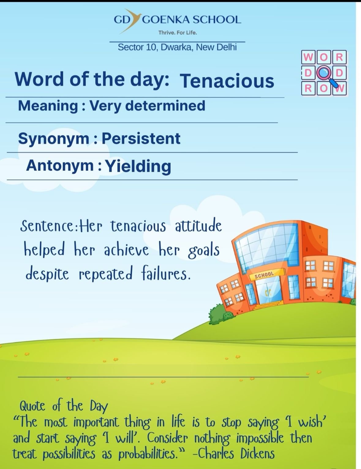 G.D Goenka School. Dwarka is a vibrant community enriching a holistic learning environment for its students, encouraging global conferences and promoting a wide range of co-curricular activities which ignites and nurtures one’s skills and passion even way beyond the classroom. Our school is a place of excellence believing that every student has a unique intrinsic spark waiting to be discovered and for turning dreams into reality. We possess an immensely dedicated and hardworking faculty. All the teachers and the staff here ensure the smooth conduct of activities all around and I’m honored and grateful to now have a position through which I can contribute to their collective efforts for a better future of every student.