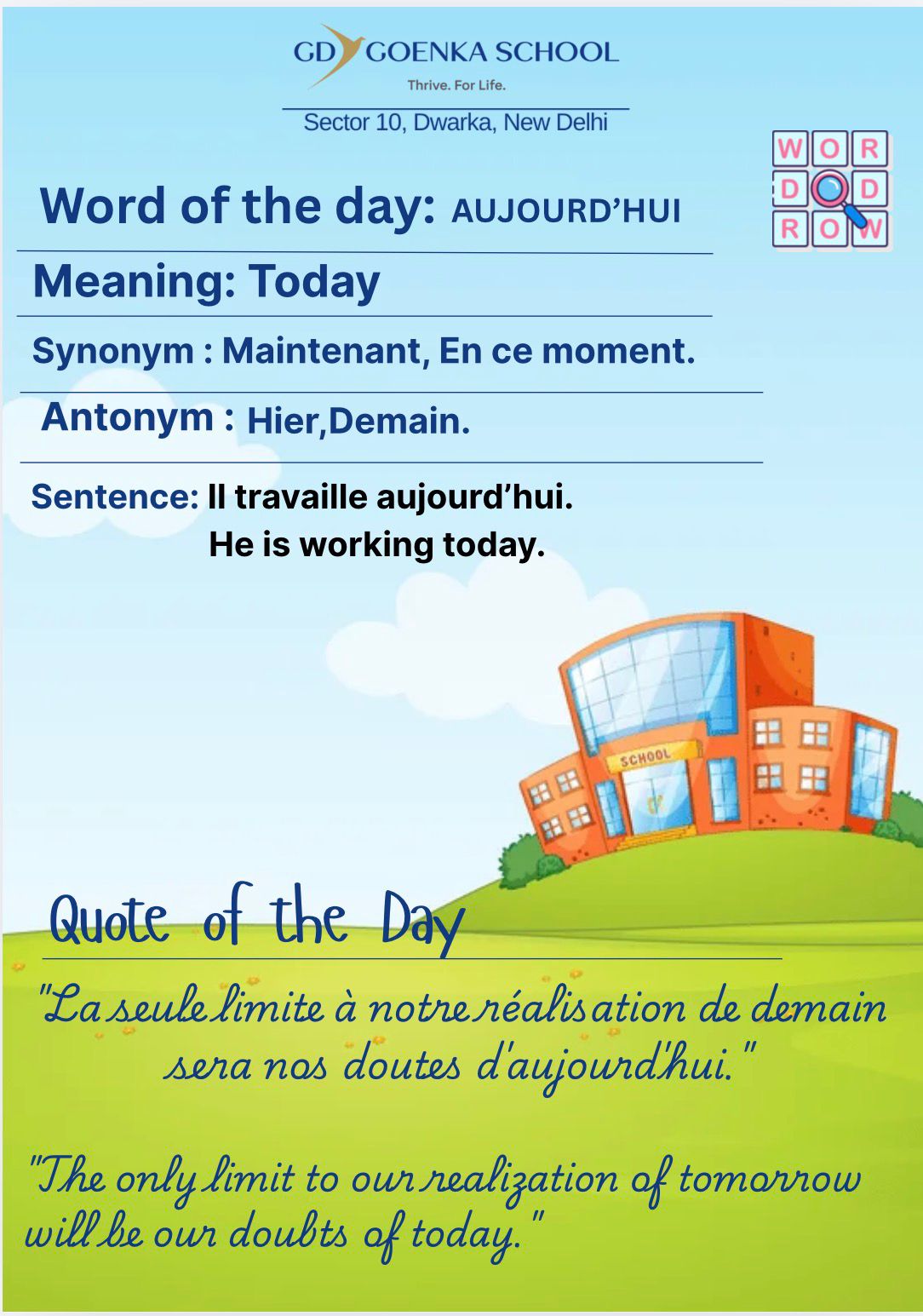 G.D Goenka School. Dwarka is a vibrant community enriching a holistic learning environment for its students, encouraging global conferences and promoting a wide range of co-curricular activities which ignites and nurtures one’s skills and passion even way beyond the classroom. Our school is a place of excellence believing that every student has a unique intrinsic spark waiting to be discovered and for turning dreams into reality. We possess an immensely dedicated and hardworking faculty. All the teachers and the staff here ensure the smooth conduct of activities all around and I’m honored and grateful to now have a position through which I can contribute to their collective efforts for a better future of every student.